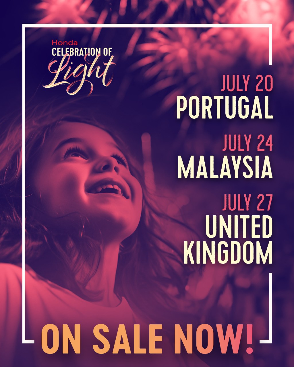 Tickets to all three viewing areas can be purchased online: www.hondacelebrationoflight.com. Pre-Sale for this year’s Honda Celebration of Light will start on Wednesday, May 22nd at 8 am, and end on Thursday, May 23rd at 8:59 am. Tickets will go on sale to the public starting at 9 am on May 23rd.